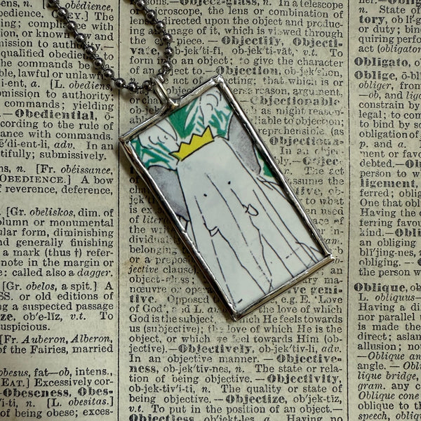 All of our pendants are created from the original source material, curated and up-cycled directly from vintage children's books, dictionaries, old calendars, and other printed materials diverted from the waste stream. We NEVER duplicate, copy or reproduce images. This means your pendant is a unique, one-of-kind item, and we enjoy good "copyright karma" by respecting the intellectual property of the original artists!