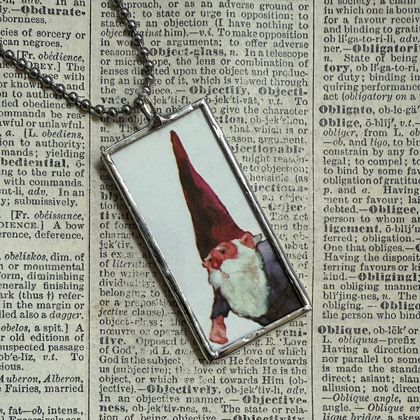 Handcrafted 2-sided pendant with illustrations of gnomes on either side that were snipped from an illustrated book of gnomes.
